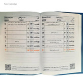 همچنین روزهای تعطیل در این تقویم جیبی چرمی با رنگ قرمز تفکیک شده است و در مقابل هر روز، تاریخ به سال شمسی، قمری و میلادی نوشته شده و مناسبت های روز نیز درج شده است.