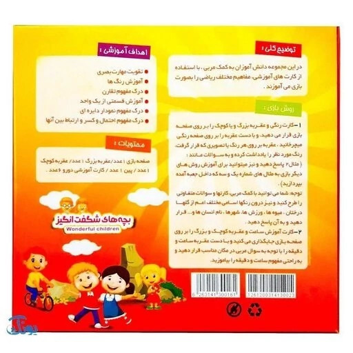 این وسیله حاوی یک صفحه بازی که دوعدد عقربه کوچک و بزرگ دارد که توسط پین به صفحه متصل می شود. علاوه بر آن شامل 6 عدد کارت اموزشی دوطرفه می باشد. هدف بازی : محور اصلی این بازی استفاده اموزشی از صفحات رنگی برای تقویت مفاهیم ریاضی طراحی شده است . بسیاری از معلمان و والدین برای اموزش مفاهیم ریاضی نیاز به ابزار دارند. مخصوصا کودکان ابتدایی به علت اینکه وقتی چیزی را می بینند بهتر یادمی گیرند ، وقتی با این وسیله کار می کنند و با آن بازی انجام می دهند مفاهیم بیشتر و بهتر در ذهنشان می ماند و بهتر درک می کنند. اطلاعات بیشتر : دربین کارتها یکی از کارتها هم تصویر ساعت است که کودک به راحتی می تواند مفهوم ساعت را از طریق آن اموزش ببیند. استفاده از تفکر عینی و رویت کردن و لمس کردن بسیاری از مفاهیم ریاضی از اهداف اموزشی این وسیله است. آسان کردن درک مفاهیمی مانند جمع ، تفریق ، احتمال ، حدس و گمان ، تقارن ، نمودار دایره ای و مهارتهای دیداری از دیگر موارد استفاده این بازی است.